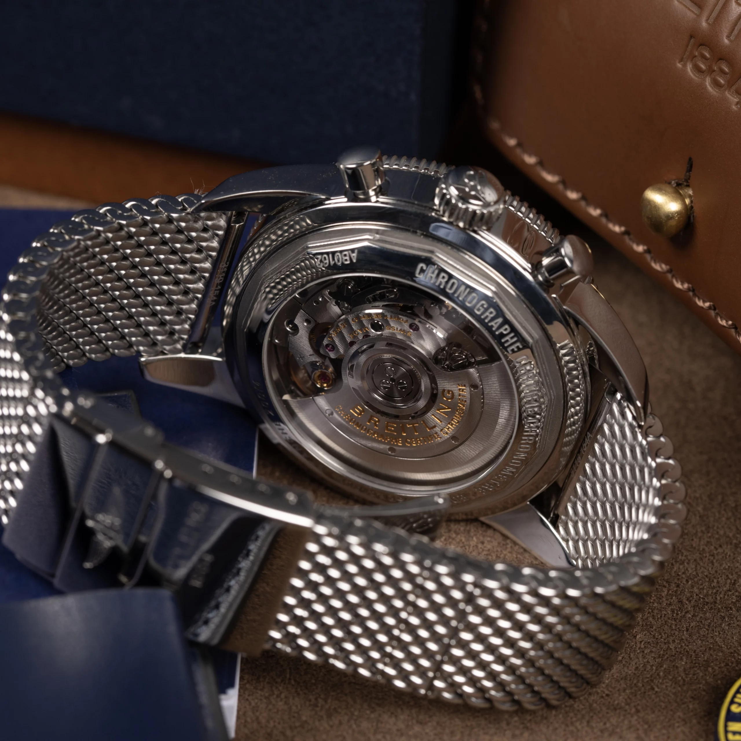 The Breitling Superocean Heritage II B01 Chronograph 44 Ref. AB0162121G1A1 is a sophisticated dive watch that celebrates Breitling’s 1957 Superocean legacy while embracing modern craftsmanship. Introduced in 2017, this 44mm timepiece features a polished stainless steel case with a unidirectional black ceramic bezel, offering a sleek, scratch-resistant surface for dive timing. The silver dial, adorned with applied indices and signature spear-shaped hour and sword-shaped minute hands coated with Super-LumiNova®, ensures exceptional legibility, complemented by three chronograph sub-dials (30-minute, 12-hour, small seconds) and a date window at 6 o’clock, protected by a sapphire crystal with anti-reflective coating. Powered by the in-house Breitling Calibre B01, a COSC-certified automatic movement, it boasts a 70-hour power reserve and column-wheel chronograph for precise timing. With 200-meter water resistance, it’s built for professional diving, while the iconic mesh bracelet—reminiscent of the original Superocean—adds vintage elegance and comfort. Discontinued by Breitling, the AB0162 has become a collector’s favorite due to its robust design, in-house movement, and connection to the brand’s dive watch heritage, endorsed by ambassadors like Kelly Slater. Its secondary market demand remains strong, with prices reflecting its quality and rarity.