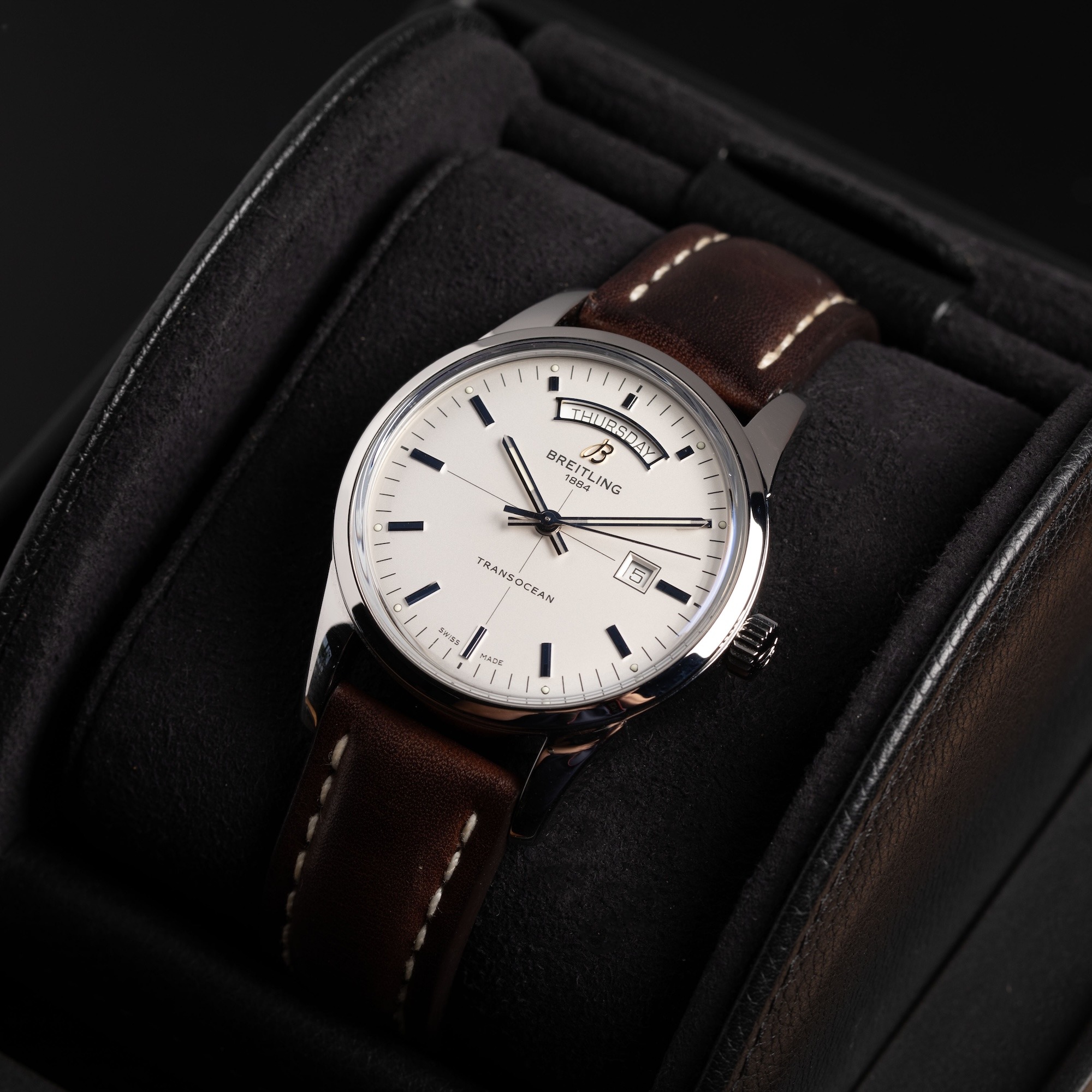 The Breitling Transocean Day Date (Ref. A45310) is a versatile 43mm automatic chronometer that merges vintage elegance with modern functionality. It features a clean dial with prominent day and date displays, the precise Breitling Caliber 45 movement, and a robust stainless steel case with 100m water resistance, making it ideal for everyday wear.