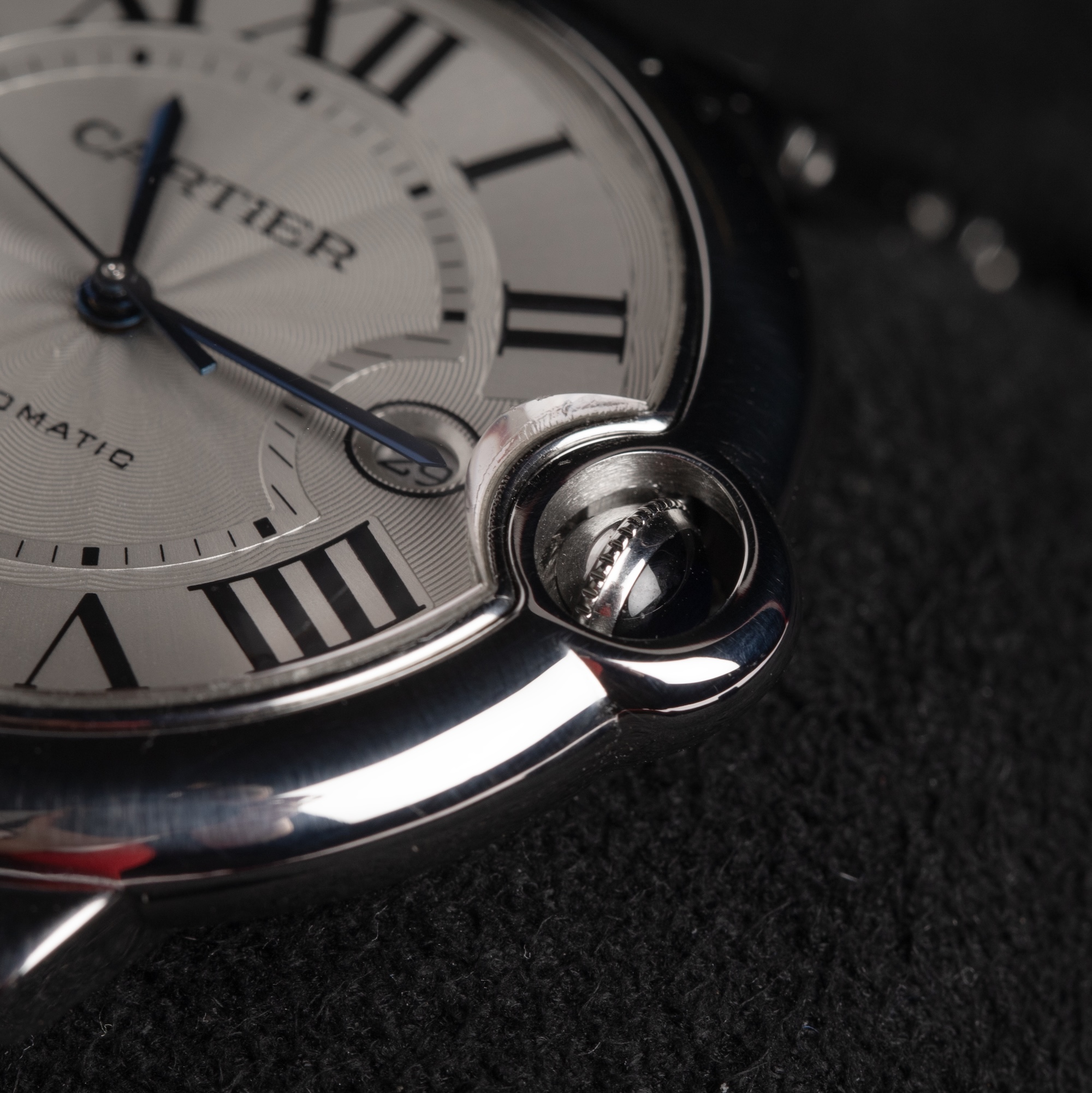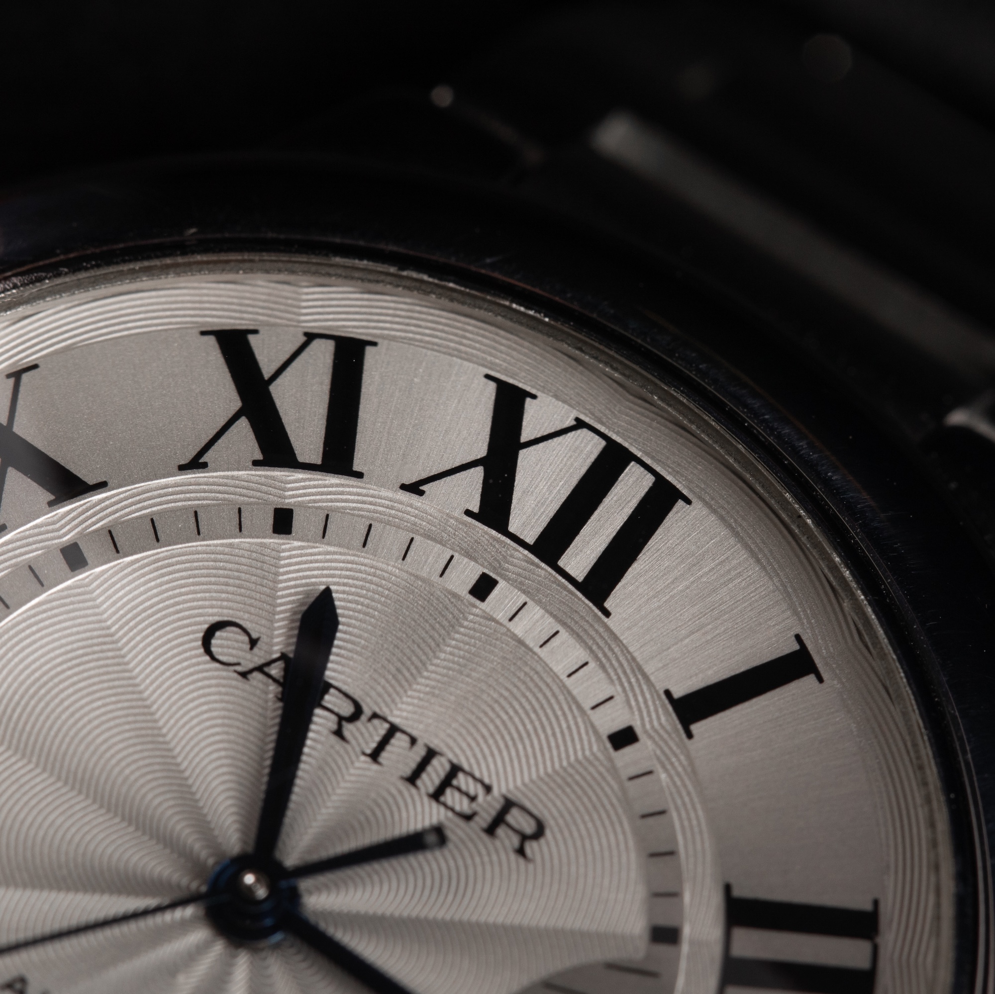 The beautifully crafted silvered guilloché dial showcases bold black Roman numerals, sword-shaped blued-steel hands, and a subtle minute track—all elements that speak to Cartier’s timeless approach to luxury watchmaking. The gentle dome of the crystal and the polished bezel create a striking presence on the wrist while maintaining a clean, sophisticated profile suitable for both formal and everyday wear.