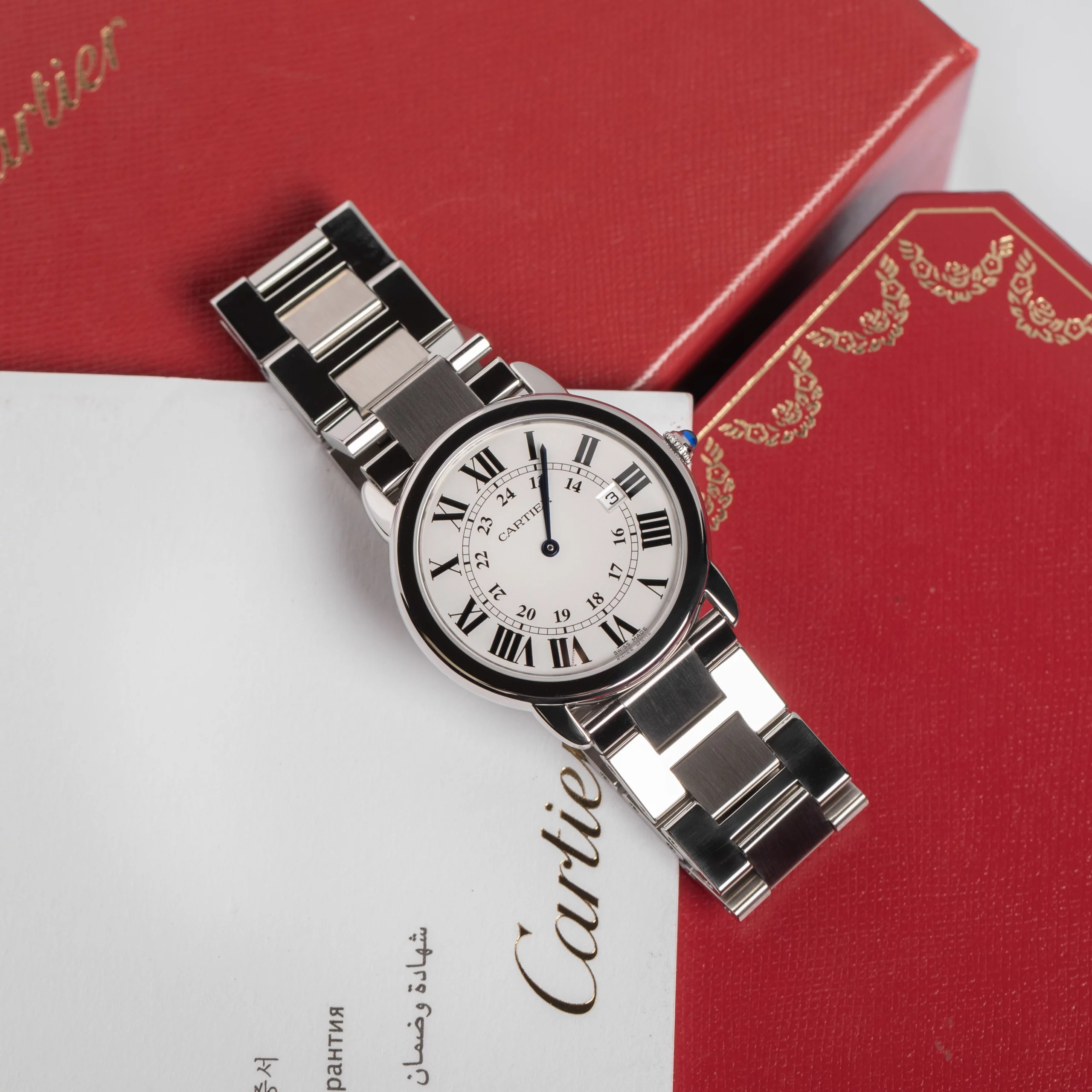 The Cartier Ronde Solo W6701005 is a timeless and elegant stainless steel watch featuring a classic white dial, bold Roman numerals, and a quartz movement for precision. With its refined design and luxurious craftsmanship, this timepiece is perfect for both formal and everyday wear.