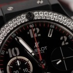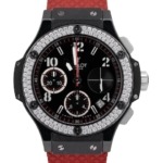 At its heart lies an automatic Hublot Caliber HUB1145, a reliable Swiss movement with a power reserve of approximately 42 hours and smooth chronograph operation. The watch’s 41 mm case is crafted from high-tech black ceramic, giving it both durability and a sleek, contemporary aesthetic. Set into the bezel are 114 brilliant diamonds — a luxurious touch that elevates the sporty silhouette into something truly eye-catching. The dial is deep black, accented with silver-tone hands and a mix of Arabic numerals and index markers, all with luminescent filling for legibility in low light. Three sub-dials at the 3, 6, and 9 o’clock positions provide full chronograph functions — hours, minutes, and seconds — while a discreet date window sits between 4 and 5 o’clock. Scratch-resistant sapphire crystal and a transparent case back allow you to admire the movement inside, while the red structured rubber strap ensures a comfortable fit and sporty feel