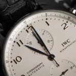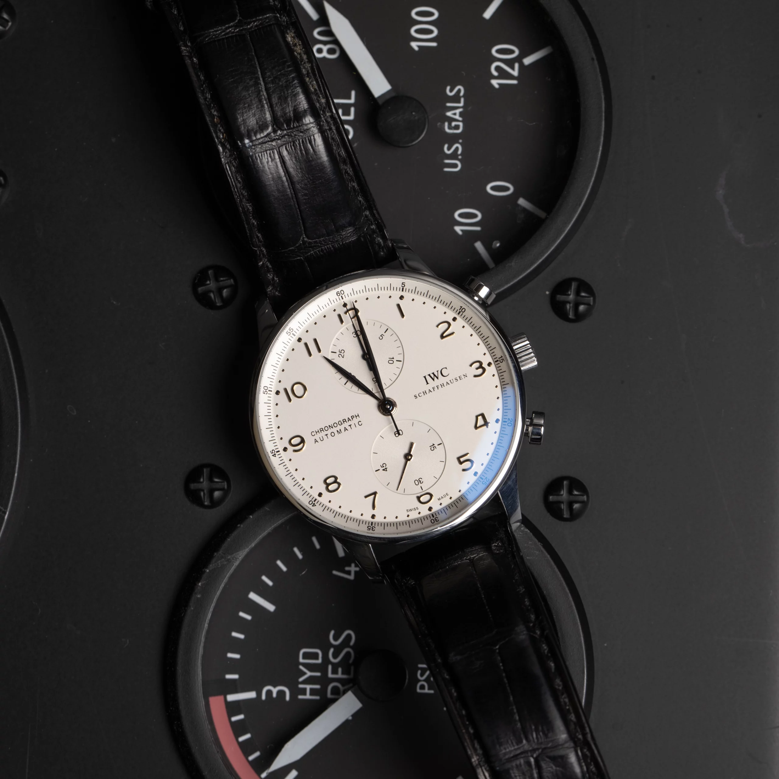 The IWC Portugieser Chronograph IW371401 is a timeless luxury watch featuring a sleek white dial, black alligator leather strap, and precise automatic movement. Designed for elegance and performance, this Swiss-made chronograph is a symbol of sophistication and craftsmanship.