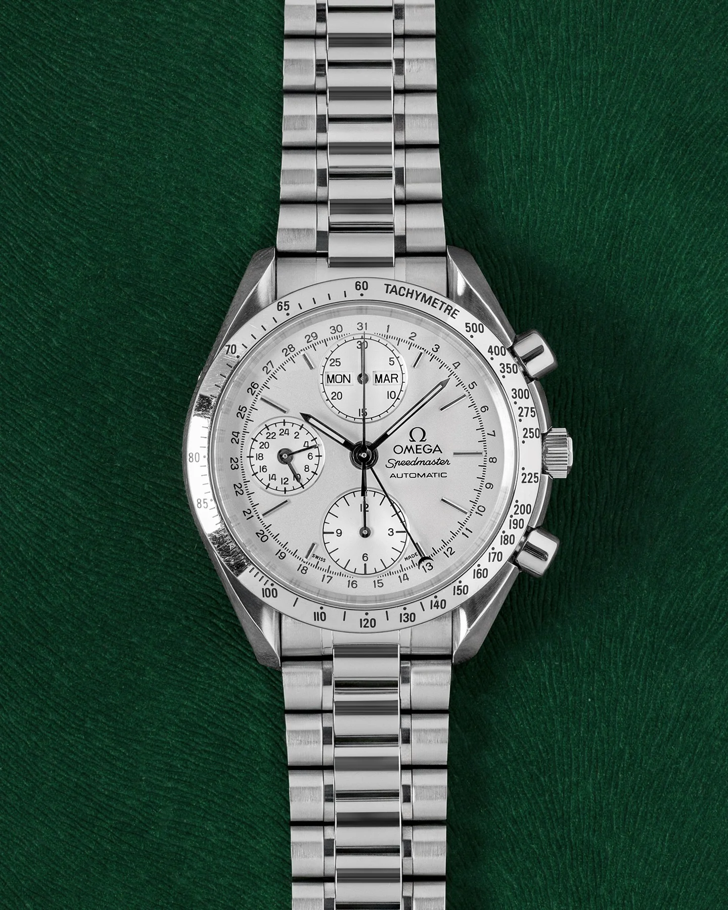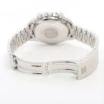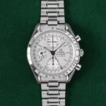 The Speedmaster’s classic aesthetic features a crisp, highly legible dial with contrasting hands and chronograph counters, a tachymeter bezel for measuring speed, and a robust stainless-steel case — all engineered for both performance and everyday wear.