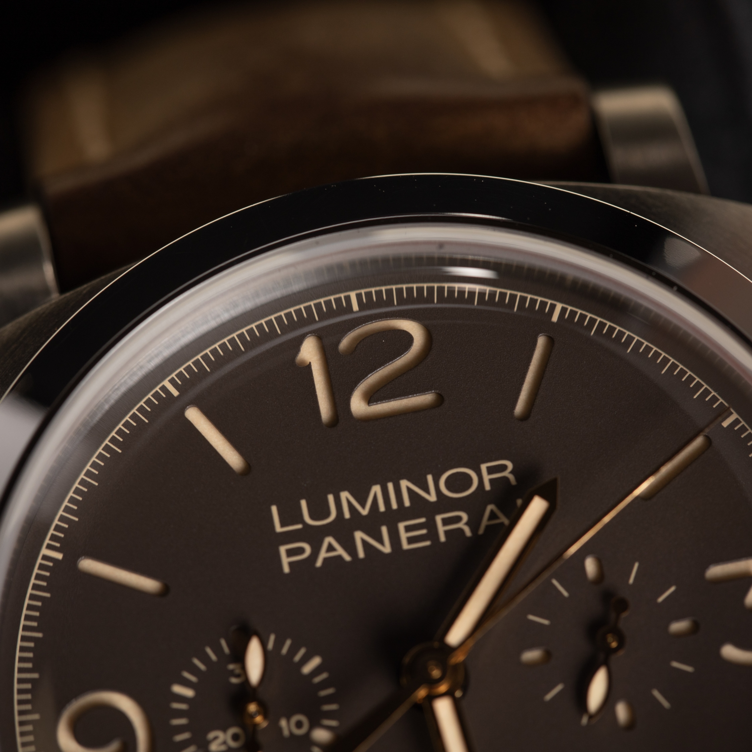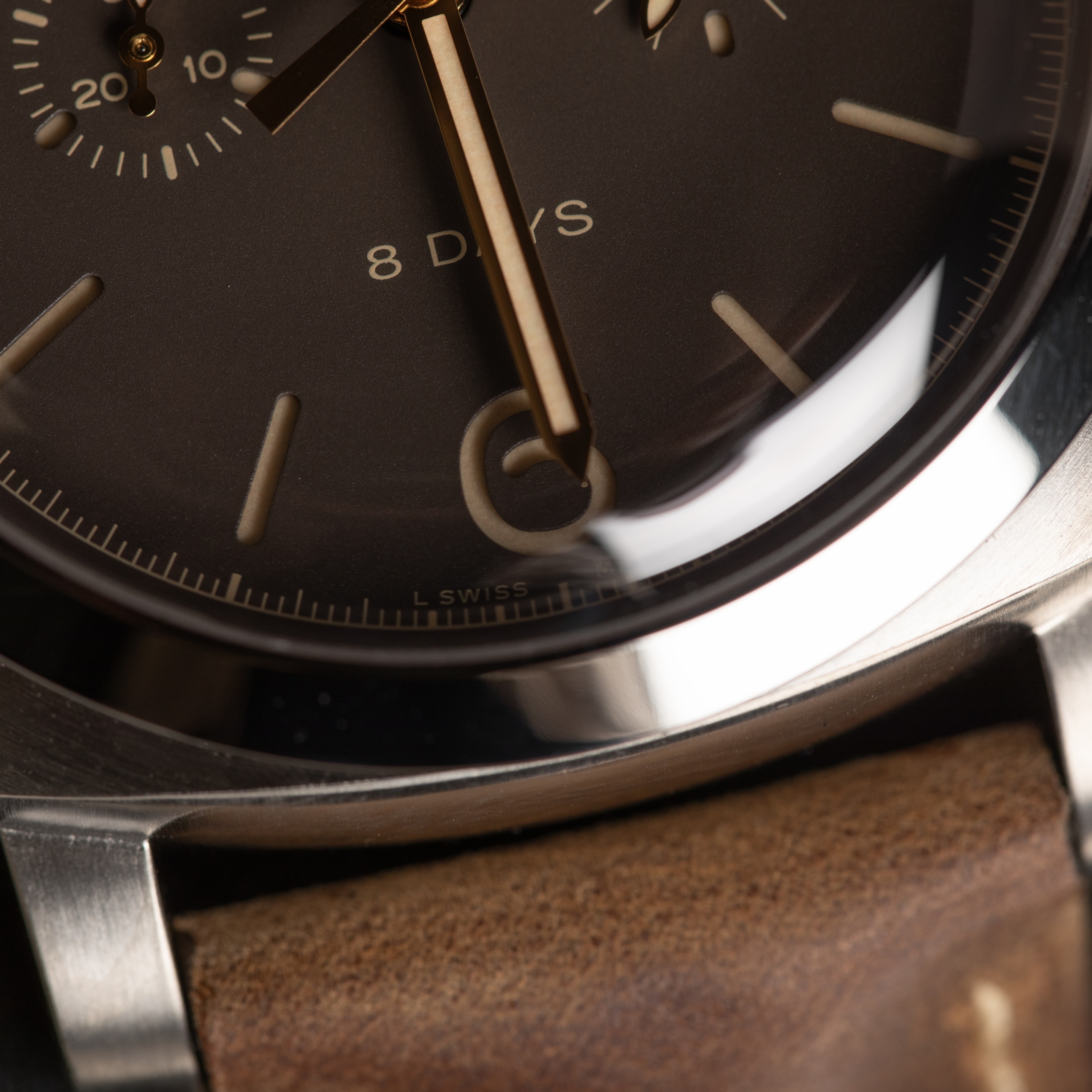 - Distinctive Dial: Brown sandwich dial with luminous markers, chronograph, seconds, and date display.