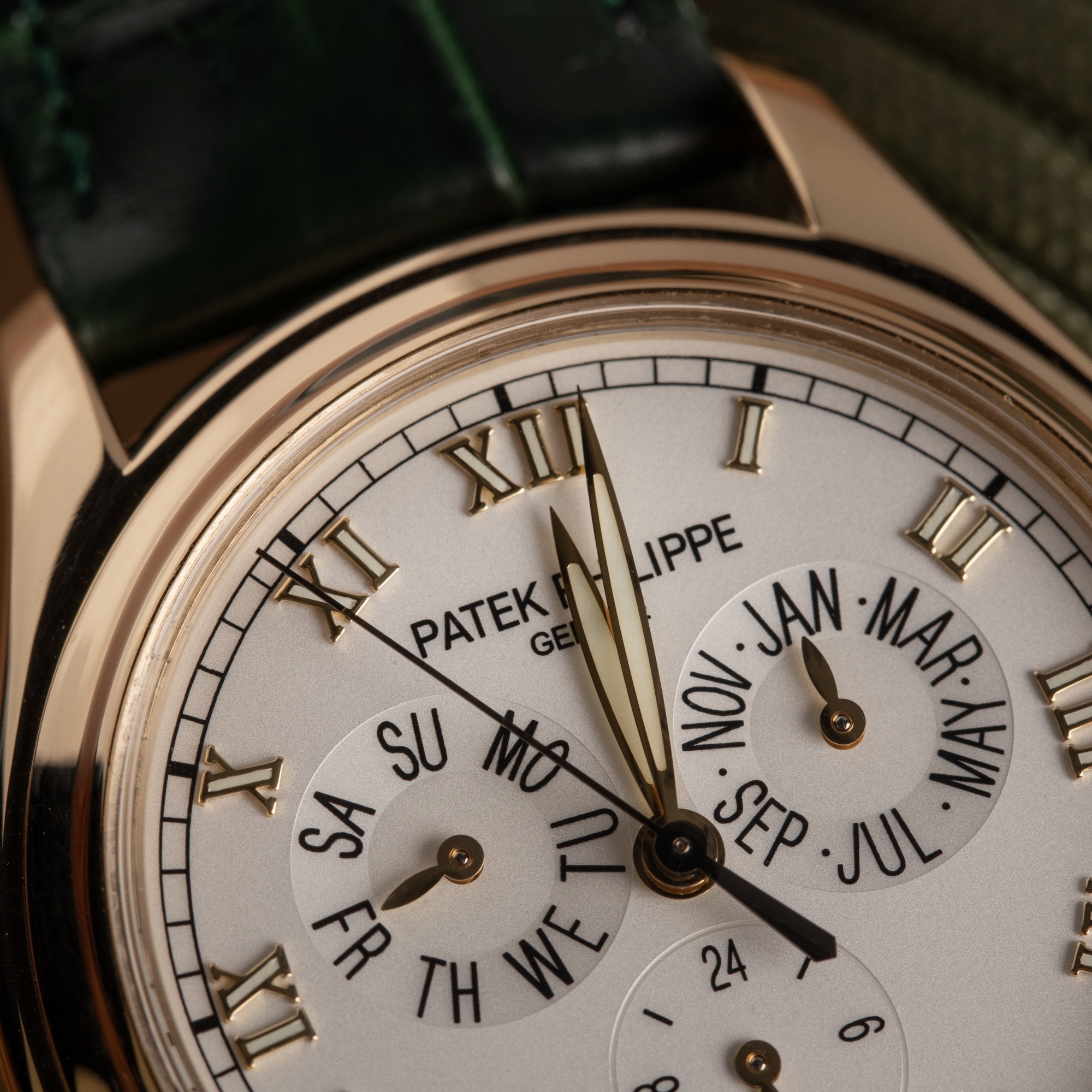 The dial is a masterclass in legible complexity, featuring Roman numeral hour markers and three sub-dials that indicate the day, month, and 24-hour cycle, with a dedicated date aperture at the 6 o’clock position. Unlike a perpetual calendar, the Annual Calendar mechanism intelligently distinguishes between months of 30 and 31 days, requiring only one manual adjustment per year at the end of February.
