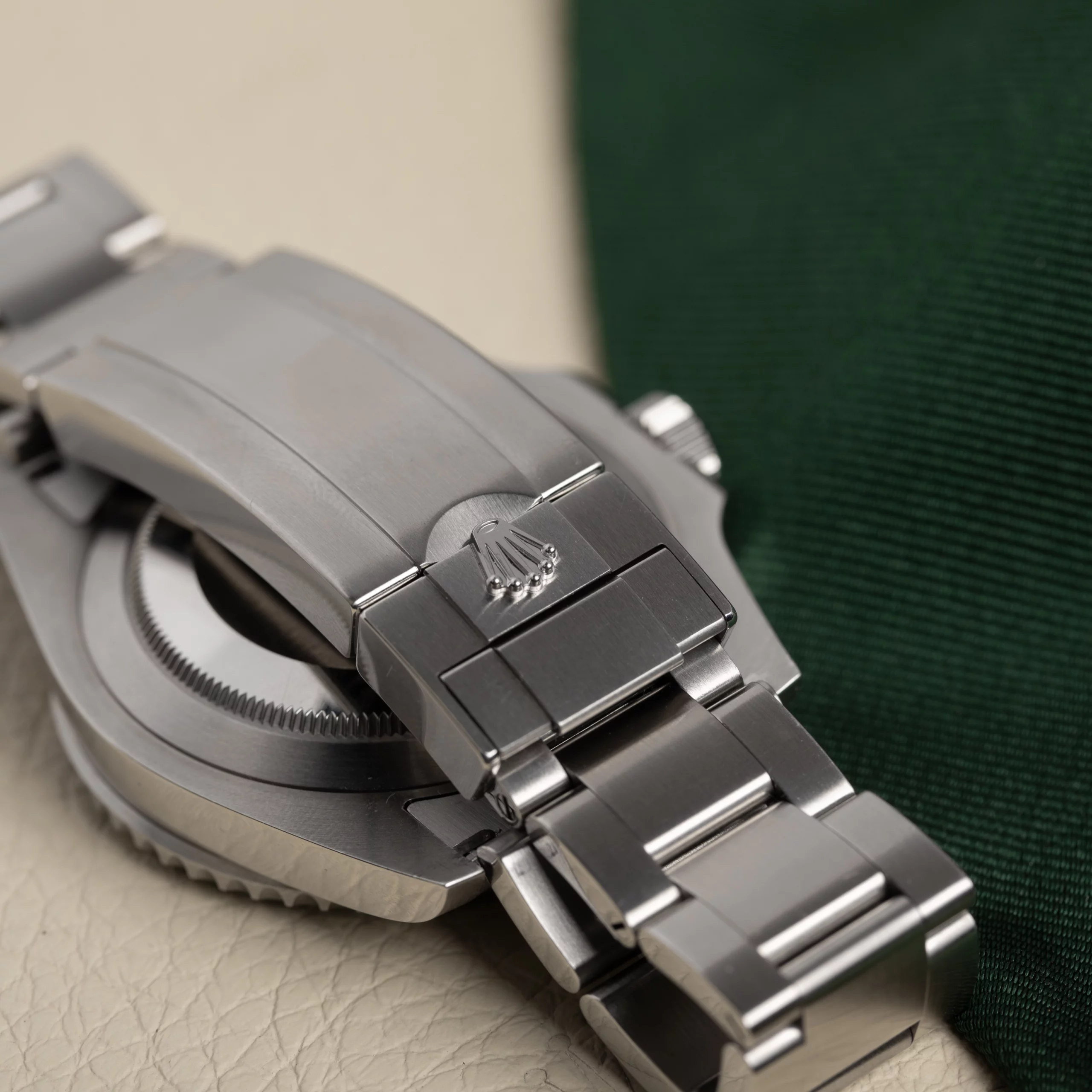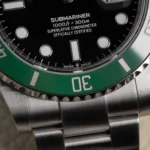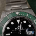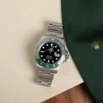 The watch is distinguished by its vibrant green Cerachrom ceramic bezel, which offers exceptional scratch and fade resistance, paired with a classic black dial accented by large luminescent hour markers and Mercedes hands for maximum underwater legibility. A Cyclops lens magnifies the date display at 3 o’clock, a hallmark of Rolex design.