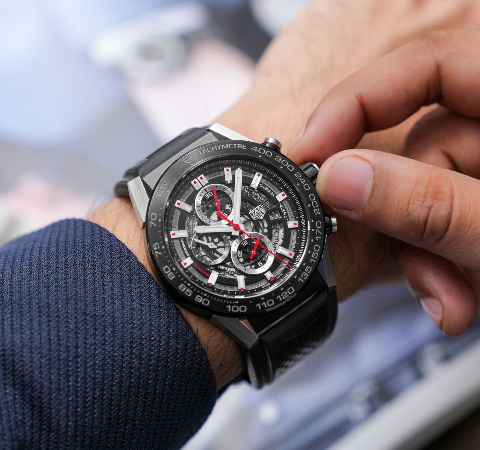 Its openworked skeleton dial reveals the intricate mechanics of the in-house Calibre Heuer 01 automatic movement, offering a dynamic view of the chronograph in action. Bold hands and applied hour markers ensure excellent legibility, while the chronograph sub-dials reinforce the watch’s performance-driven design.